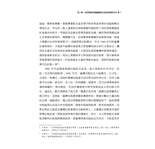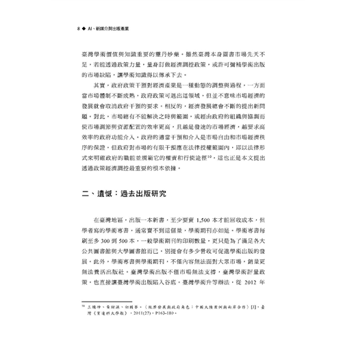 臺灣出版產業整體產值下降,促使許多出版社跨足圖書銷售通路經營。對於單純僅倚賴圖書市場的專業或學術出版社而言,其營收卻受臺灣出版整體環境不佳影響較大。政策干預對經濟產業是一種動態的調整與過程,一方面當市場體制不斷成熟,政府政策可退出這領域,但並不意味市場經濟的發展就會取消政府干預的要求。從圖書需求與圖書價格而言,專業學術類書種的市場需求彈性小,加上產品特殊與知識內容門檻較高,導致該類圖書價格彈性低,市場競爭力小。但,學術類圖書的外部性極高,容易產...
