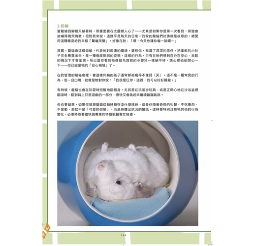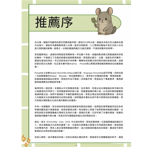 我衷心期盼,這本書能成為每一位飼主案頭必備的參考,無論是初次接觸龍貓的新手,還是多年經驗的老手,都能從中獲得啟發與指引。更重要的是,願它成為連結台灣與世界龍貓文化的重要橋樑,讓更多人看見並珍惜這些來自南美洲高原的小生命。