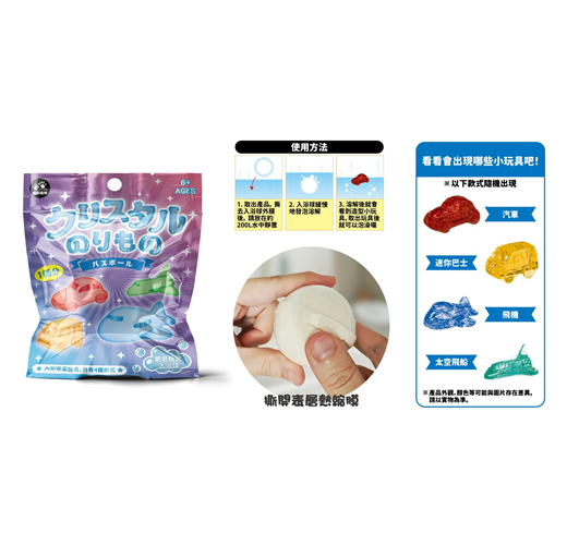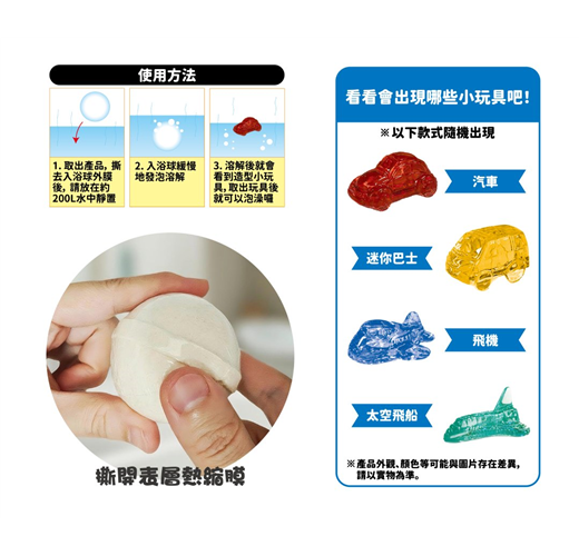 2.浴鹽球遇水溶解後釋放內藏公仔,滿足兒童好奇心,洗澡過程如同“拆盲盒”,提升洗澡樂趣。