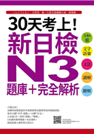 《30天考上!新日檢N3題庫+完全解析》隆重登場!您正傷腦筋該怎麼準備新日檢N3嗎?除了死背硬記單字之外,為了熟悉考試題型,您是否還在考慮一次寫個完整5回、10回的模擬考題呢?