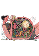 故事的開篇母親巨大的形象清晰可見,但隨著每一頁的展開,當孩子在自己的人生道路闖關,母親似乎逐漸縮小融入孩子創作的畫面中,也從主動照顧和引導,轉為故事裡的配角。 如果你仔細觀察,每一頁母親都變身成不同的角色,有時是織毛衣的美人魚,有時則是洗衣服的人馬,不時還彎腰收拾殘局。但有時媽媽也會變成噴火龍,有時也會累倒,不過總是陪在孩子身後,引發人思考母親角色定位與努力。