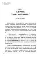 在本書的主題簡介,本校教務長張志偉(Isa Walis)教授介紹本次講座《生態與靈性(Ecology and Spirituality)》的發想,並概要說明生態與靈性的關係,最後提出三...