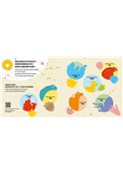 別錯過前扉頁,多彩繽紛的甜甜圈一定會吸引孩子的目光,讓其驚喜。親子共讀時,可附和孩子的反應:「哇!好多甜甜圈唷!這是草莓口味的、這是巧克力口味的……(指物命名)」,再繼續追問:「草莓口味有幾個?巧克力有幾個?(歸類)一起數數看,總共有幾個?(點數)」等。而在書名頁中,還可指引孩子注意:「甜甜圈在哪裡?(圖形辨識)有黃色、藍色、粉紅色(顏色),數一數,總共有幾個?(點數)」。