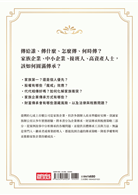 資誠家族辦公室以多年實務經驗,將本書分為企業傳承、財富傳承與稅務策略三部分,從案例故事中分析傳承的各種問題,並提供具體傳承工具與方法。無論是掌門人、繼承者或專業經理人,都能找到合適的傳承策略,降低爭權奪利並推動家族企業持續成長。