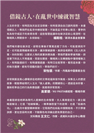 非常佩服並真心讚嘆詩佳老師的文學底蘊與寫作風格,採集古人的歷史故事,輕鬆帶給現代人五大「做人處事」的關鍵核心。透過這本好書,重新校準自己的行為與價值觀,我覺得非常受用。