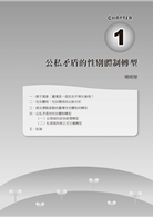 3. 第二篇「法律政策倡議在臺灣的實踐」,則提出與國際相較,臺灣較為成功的性別政策法律案例,包括五大領域以及五大法案。五大領域分別是:教育體系、司法體系、醫療領域、文化領域、公共托育制度;五大法案包括《民法》、《優生保健法》、《性別平等教育法》、《司法院釋字第七四八號解釋施行法》,以及《生產事故救濟條例》。