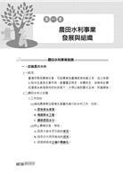 本書第一部分〈農田水利概論〉根據考科命題趨勢編撰,以「臺灣農田水利事業歷史與組織發展」及「農田水利灌溉及排水相關基礎理論」為核心重點,各章再詳細說明「灌溉與排水系統」、「灌溉計畫」、「灌溉排水系統區分與管理組織體系」、「農田水利建設計畫」等重點內容,並輔以圖表歸納說明與關鍵字標示,清楚指引得分捷徑。