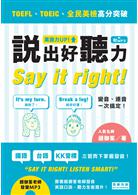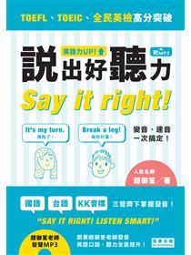 《英語力UP!說出好聽力─Say It Right》本書跟同類型書籍最大的不同是,每一個變音規則都是以國人最明確易懂的解析方式來歸納舉例,並立即佐以TOEFL、TOEIC及英檢等各類測驗中台灣同學最易誤聽的組合做即時的矯正。語音解析方面,沒有抽象難懂的舌位口型圖片,善用我們原有的母語,除了國語外, 還利用了發音部位不輸給英文的台語來做類比練習;充分利用我們原有的發音機制,來運作不同的語言中相同的語音。