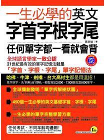 如果你還因為準備某種英檢考試而購買一本單字書的話,那你就錯了!其實大學學測或指考、全民英檢、新多益、甚至是留學考試托福、雅思等任何考試考來考去都考那些單字。如果要為每一種考試而購買一本單字書研讀的話,真的可以念完整本嗎?而且我相信裡面單字重複的頻率也是可想而知的。所以,想要有效地準備任何英檢考試其實很簡單,只要學會一套有效的單字記憶法之後,任何考試、任何單字都不是問題。《一生必學的英文字首字根字尾》一書中提供了 兩大學習特色,讓讀者更穩紮穩打的奠定英文基礎:
