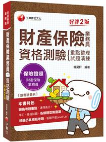 除了拼命死背題庫外,你有更好的選擇!千華數位文化所出版的《財產保險業務員資格測驗 重點整理+試題演練》全書系統化的區分課文重點,並將所有考試題目循序漸進的分作牛刀小試和章後精選試題以及全範圍仿真模擬試題,不僅讓你有階段性(由小到大)的目標複習,更有實務經驗的名師為你精心編錄大範圍仿真模擬試題,並針對較易混淆的難題加以解析,相信不僅能幫助你順利獲取證照,更能幫助未來踏入保險業的你理解更多的實務操作,比別人提早做好準備!