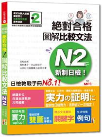 為了讓《新制日檢絕對合格圖解比較文法》系列成為一套書,讓讀者能從N5一直學到N1,我們把《關鍵字版 日本語圖解文法比較辭典 中高級N2》改版成《新制日檢!絕對合格圖解比較文法N2》了。
