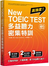 「New TOEIC TEST多益密集特訓系列」專為目標分數700-900的考生所編寫,包含《New TOEIC TEST多益聽力密集特訓》、《New TOEIC TEST多益文法密集特訓》以及《New TOEIC TEST 多益閱讀密集特訓》。全系列分析多益名校Essence English School的考生答題資料庫,以階段式訓練方式,協助讀者熟悉多益關鍵題型,提升答題速度和精準度。