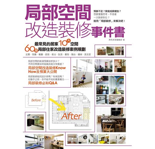 若您有以上問題不用再擔心!透過「局部裝修」概念改造居家,即使時間不夠、預算不足、,也能獲得良好的解決方案。《局部空間改造裝修聖經》一書,以居家不同空間為單位,系統化分類,針對玄關、客廳、餐廳、廚房、衛浴、臥房、更衣室、書房、樓梯、陽台等10大空間為主題,深入介紹解析局部空間的改造重點。