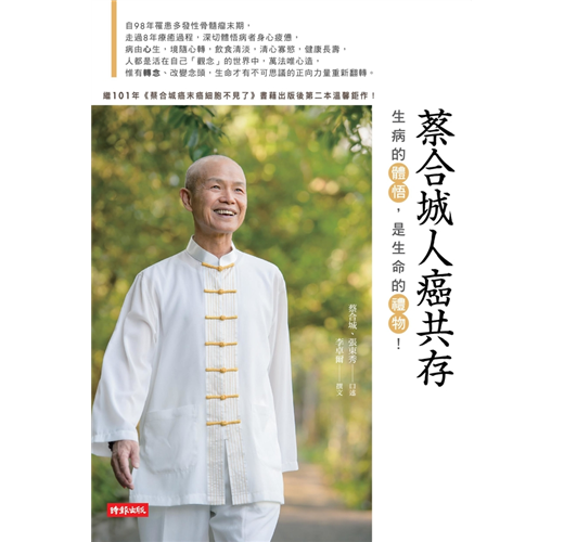 太多的人生病時不知該如何做調整,不知道生活的環節中哪裡出了問題? 容易將自己又陷入「恐懼」的深淵,害怕治療副作用,害怕不化療腫瘤會變大,害怕做完治療要面對轉移及復發……要如何在情緒上和身體上善待自己、幫助自己、提升療癒力?第二本新書《蔡合城人癌共存》,就是要鼓勵所有朋友從「心」生活,共修行善,學習在面對病痛時真心為自己的習性懺悔,用一份願力和轉念的心,勇敢積極面對癌症的挑戰,才能將人生的每一分、每一秒過得萬分精彩。