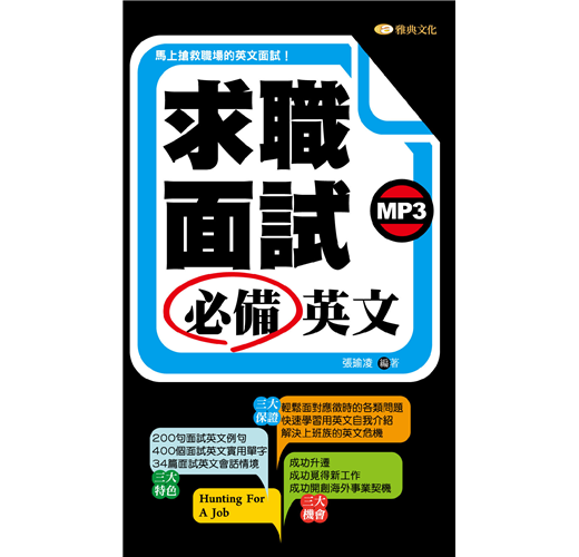 本書特別針對以上各點,做例句的說明,讓您在最短的時間內,有效率地、分門別類地學好用「英文面試」的技巧。