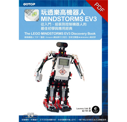 本書一開始即引領組裝出簡單的機器人,並透過簡單的程式設計技巧,利用EV3中的馬達與感測器進行各種實驗。接著,會逐漸組裝出更精巧的機器人,並學習到更進階的程式設計技巧,例如像是如何運用資料線、變數,或是建立自訂指令塊…等。還會學到如何在自己的設計中,使用像是長桿、齒輪、連接器等各種零件的重要組裝技巧。