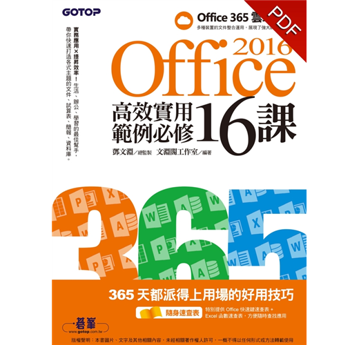充分掌握 Office 2016 最常使用的Word、Excel、PowerPoint、Access,結合了生活、行政、企宣活動、人力資源、業務研發、市場行銷、進貨銷貨…等各行業的實務應用範例,並搭配精心錄製的影音教學,讓學習效率更加倍。
