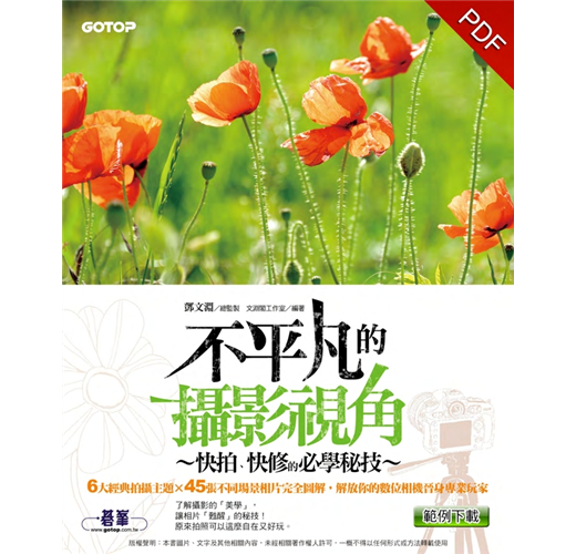 不用懂得艱深攝影理論,直接透過作品了解到拍攝者的構思與想法。只要照著作品所設定的數值與環境條件,即可掌握相似的主題。最後再透過 Photoshop軟體的快修重點,讓作品更加完美。