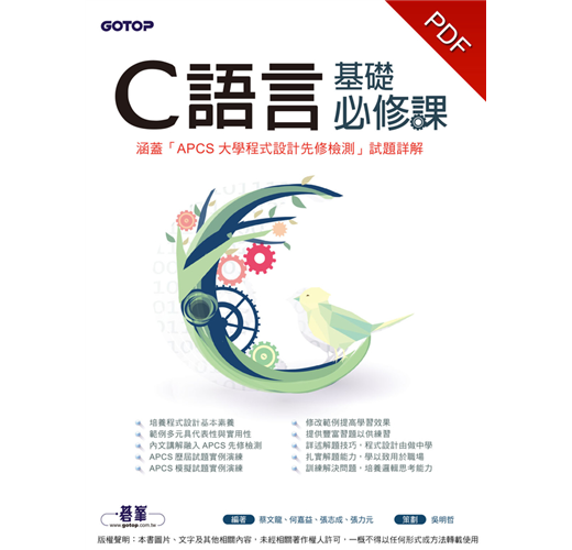 本書注重在C語言程式設計觀念,解說以運算思維、問題解決與程式設計觀念為主,其內容包含資料型別、變數生命週期、選擇結構、重複結構、陣列、函式、遞迴、自定資料型別與檔案等等,每章皆有整理歷屆APCS觀念題與實作題試題詳細解析,使初學者具有APCS檢測解題能力。