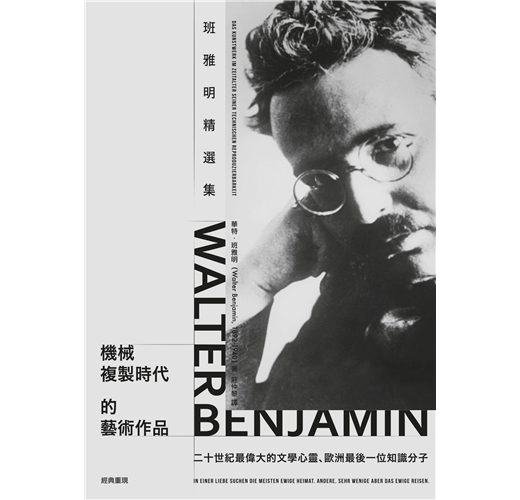 在臺灣,英國藝術評論家與作家約翰.伯格(John Berger)《看的方法》(Ways of Seeing, 1972)於一九八九年翻譯出版,書中大量援用〈機械複製時代的藝術作品〉的觀念,讓班雅明開始廣為人知。解嚴後在引介西方思潮中扮演關鍵角色的《當代》雜誌,於九○年代初陸續刊登不少關於班雅明的論文。一九九八年第一本班雅明的中譯本《迎向靈光消逝的年代》出版,收錄了〈攝影小史〉與〈機械複製時代的藝術作品〉,之後他的繁體中譯本多以單行本的方式進行,且篇幅較小。這次商周出版的《班雅明精選集》是首度收錄他大量代表性著作的選集(唯一例外,是當年可以在唐山書店買到香港牛津大學出版社於一九九八年出版的《啟迪:本雅明文選》繁體中譯本)。