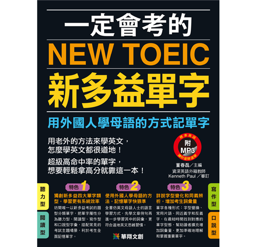 《一定會考的NEW TOEIC新多益單字》是特別針對多益考試量身打造的,按單字屬性分為4類別:聽力型、閱讀型、寫作型和口說型字彙,又再依單字屬性細分為:經濟類、醫學類、工作類、教育類、科技類等。如果你在做聽力測驗模擬試題時,銀行和醫院用語常聽錯,那你可直接翻到本書聽力型字彙下的「銀行金融」和「醫院就醫」,然後記下裡面的單字,這樣的分類學習方式,是不是感覺更符合人性呢?這絕對是坊間唯一獨創,貼心考量了考生需求,讓學習者內化單字更有效率!