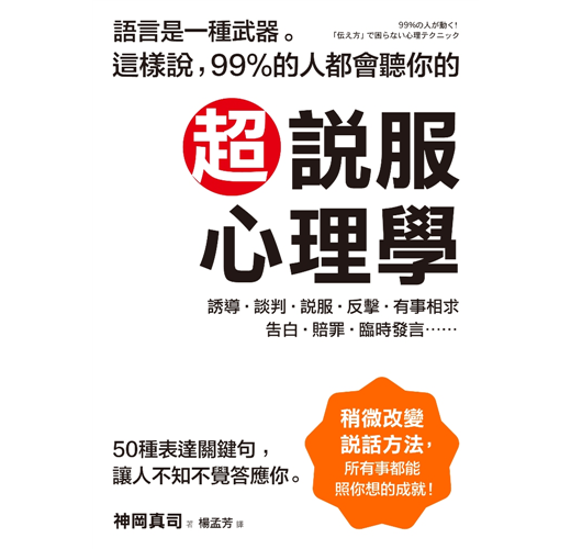 心理溝通專家特別選出50招「成功說服的本事」,舉出在生活中已察覺或未察覺的表達技巧,帶入心理學理論加深印象,讓人可以「直覺」猜到對方的想法,根據這點去回話便能置入自己的意圖影響對方,100%達成說服目標。