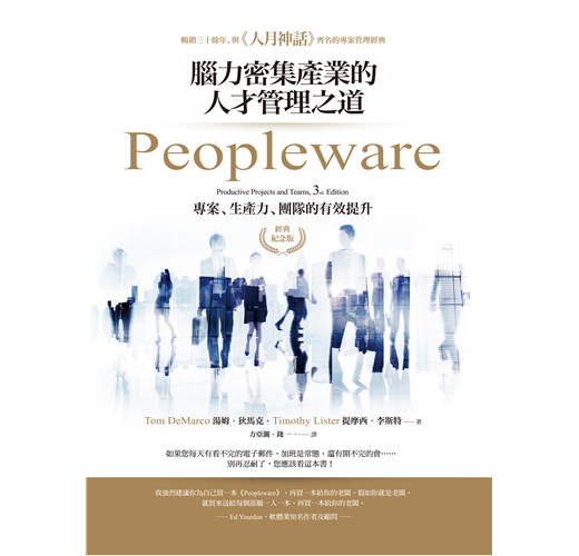 我強烈建議你為自己買一本《Peopleware》,再買一本給你的老闆。假如你就是老闆,就買來送給每個部屬一人一本,再買一本給你的老闆。——Ed Yourdon,軟體業知名作者及顧問