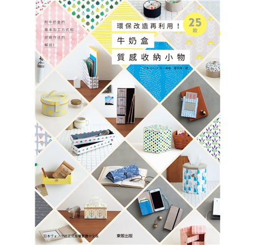 可直立也能橫擺的附抽屜筆記文件收納盒、多隔層六角直立式筆筒、超便利抽取式塑膠袋收納套、三段開闔式飾品收納盒、附小口袋手機收納套、風琴式卡夾收納包…;凌散的桌上小物、文具用品、心愛首飾配件,可裝飾也能佈置的環保手藝,讓廢棄不用的牛奶盒從此小兵立大功,為家中的擺設更增添美麗又實用的一隅。