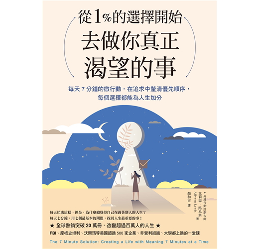她親自嘗試歸納出「7分鐘行動計畫」,用現代人最能夠聚焦的7分鐘,每天提醒自己聚焦最重要的核心,每天只要做對1%的選擇就好,因為生命是由一連串的小選擇、小決定所累積並匯集成改變命運的轉捩點。她透過30則真實動人的故事,帶你重新回顧生命,發掘內心深處的想望。