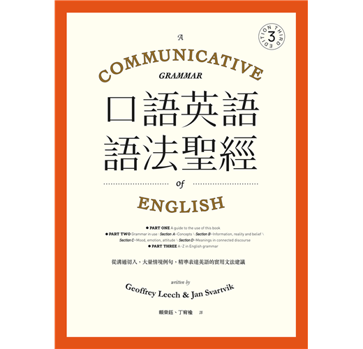 如今,EZ叢書館引進這本語言教學界的長青之作《A Communicative Grammar of English》第三版,將有助讀者了解英語口語背後的語法規則,進而能大幅提升口說英語的能力。兩位作者 Geoffrey Leech 和 Jan Svartvik 都是國際知名的語言學家,專長為英語語法和語料庫等領域,相關著作論文等身。本書第一版於1975年上市就廣受學界肯定,筆者於1992年在美國紐約大學攻讀英語教學碩士學位時,教授就指定這本書為必讀的工具書,如今多年後,終於可在台灣看到精編的第三版中文繁體書上市,真是備感親切,更為國內的學子感到慶幸。