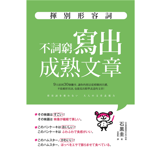 「很可愛」、「很厲害」,形容詞的濫用是一種表達上的偷懶,容易讓語意模糊不清。 石黑圭老師以簡單易懂的說明配上大量例句,對日文學習者來說是一本會忍不住想一直做筆記的書。