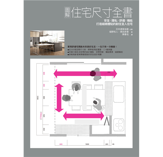 本書將住宅區分為13個空間(玄關、樓梯、廁所、洗臉室、浴室、和室、廚房、餐廳、客廳、主臥室、小孩房、衣帽間、陽台),針對各自空間的機能、配置和重要功能,淺顯易懂地統整出其間的生活行為所應該有的合理尺寸。並特別將高齡者的安全及無障礙設施納入設計考量。是一本針對專業住宅設計者、考慮購買或興建自用住宅人士,對應少子化、高齡化社會相當實用的設計實務參考工具書。