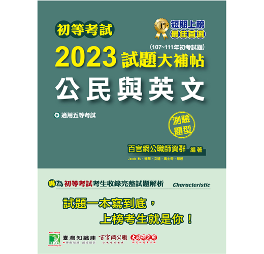 【試題大補帖系列熱賣中!】 不容錯過的上榜必備好書在這裡! 精選多年度初等考試歷屆試題,讓你省去到處尋找考古題的煩惱! 試題按照年度排列,迅速掌握出題方向 每道題目提供完整解析,測驗、複習一把罩 本書收錄初等考試【公民與英文】107~111年共五年的測驗試題詳解,幫助您一次準備全面應戰、熟悉題型順利上榜。 本書收錄科目包含:公民、英文 本書收錄考試包含:鐵路佐級、初考、地方特考、司法/國安五等 本書特色: 1.補班名師解題,不用三顧茅廬立即獲得大師精準考題解析。 2.多年度試題一次收錄,輕鬆練習歷屆試題。 3.一題搭配一詳解,演練有錯立即修正,加深印象。