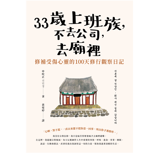 普通上班族。被身邊的人稱為「努力中毒者」。雖然獻身職場,但被同事們疏遠,業務上也被否定了存在的價值。身心俱疲而選擇辭職。雖然跟宗教無緣,但是在認識的心理學教授介紹下,放下一切,前往「寺廟」。原本只是迫切地想拯救自已罷了,卻在意想不到的一百天寺廟生活裡,傾聽內心聲音,觀察與探索自我,同時接納了笨拙的自己、與自己不同的人,還有本就無法如願以償的生活。感謝自己得到的一切,努力地過好今天。