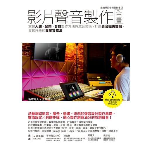 網路影片戰場激烈,從巨量影片脫穎而出的關鍵在於聲音。本書以掌握最低度的音響知識技術做出有如專業質感的作品,說明聲音特性、音響設備設置方式、聲音製作的通用做法。具體示範利用音樂軟體自創配樂、從音效素材製作理想音效、錄音作業的重點技巧、從搭配影像調整雕琢各聲音的定位、音質、音場、音量、音壓,逐步完成高品質的影片。不論是影片創作者升級作品質量,或音樂創作者涉獵影像、聲音後製入行,都是一本實務應用強的寶典指南。