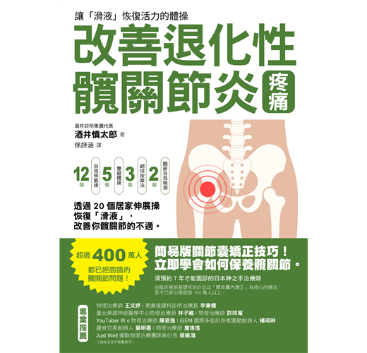 「本書中,除了提供多張圖文並茂且淺顯易懂的「運動衛教圖卡」,給有髖關節衛教運動需求的讀者做為參考之外,酒井老師也從坐、站、臥、行等面向來告訴讀者如何「調整生活習慣」來有效保養髖關節。」-臺北榮民總醫院神經醫學中心神經修復科 物理治療師/林子崴