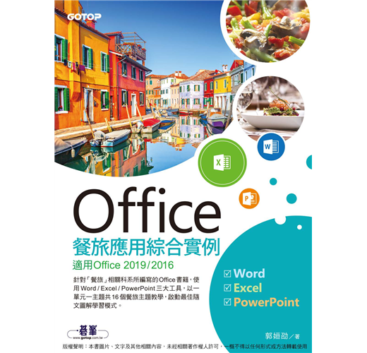 涵蓋Office 2019三大文書軟體Word、Excel、PowerPoint,精心設計16個餐旅範例,從作品展示、學習目標、範例實作、到練習評量,貼近餐旅應用實務教學!