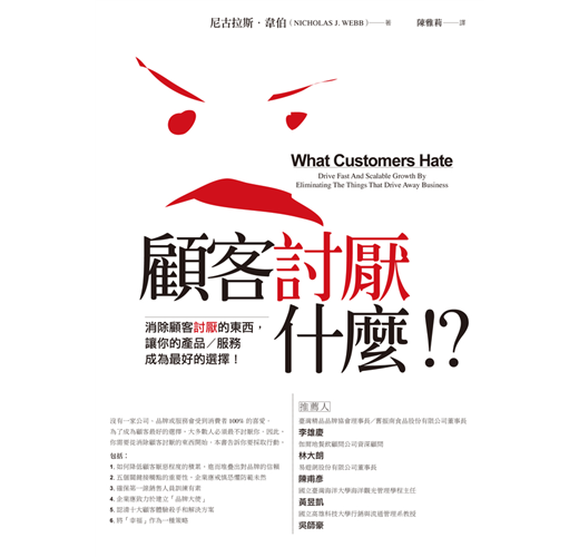 本書作者尼克‧韋伯(Nick Webb)是顧客體驗和服務的全球頂尖專家,當大家執著於滿意度調查(不滿意—滿意)的時候,他提出另一個較少被討論的觀點─「顧客討厭什麼?」。「討厭」可能是社會科學家希冀在消費者黑箱(black box)挖掘的寶藏,因為,影響消費者惠顧並產生忠誠的因素,雖然已有約90%被發掘並實踐中,但當所有企業都採用相同觀點與作法(服務很難申請專利保護),哪一家企業能率先實踐本書的建議「減少顧客厭惡點」,即使其對顧客惠顧的影響力僅有5%,卻是競爭致勝的關鍵因素了。