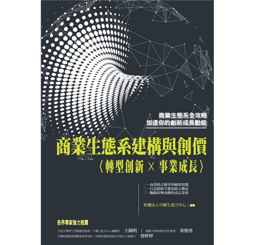 中國生產力中心出版的《商業生態系建構與創價》顧問手冊,為企業提出了實務面的具體操作建議。先由商業生態系統的精神與成功關鍵一一拆解,建立起企業對於建構生態系的基本先備知識;再進入實戰模擬階段,以生態系的主導者為例,帶領企業逐一檢視自身商業模式,如何轉型為創新的生態系運作模式,將流程中的操作要領、步驟均詳細解說,協助企業在本手冊顧問的指引下,能更有效率地整合資源與特色,朝向轉型創價成功之路邁進。