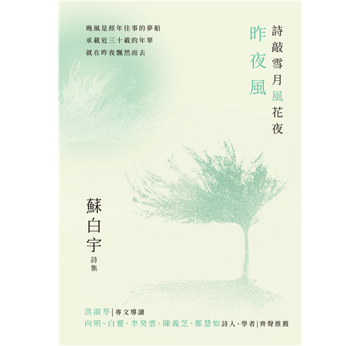 她是——主婦的代言人、都市的速寫者、自然的歌詠者、時間的行路人。蘇白宇執著地凝望想愛的人、想愛的生活,用文字捕撈起日常瑣碎中的詩意。《待宵草》、《一場雪》、《昨夜風》、《已殘月》四本詩集承載了她近五十年的歲月軌跡,分別代表蘇白宇不同年華的思懷與感悟。