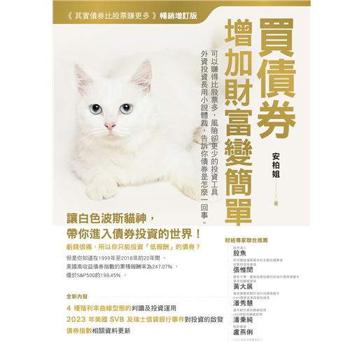 唯一一本小說體的債券投資入門。作者30歲之前希望成為一個小說家,發表過短篇小說;接觸債券投資領域超過20年,以自身的經歷,決定以創新的手法,寫一本債券投資入門。她創造一隻具有神力的貓,引導自己股票投資失敗的主人如何投資債券。讓你在津津有味中讀完全書,了解債券根本。