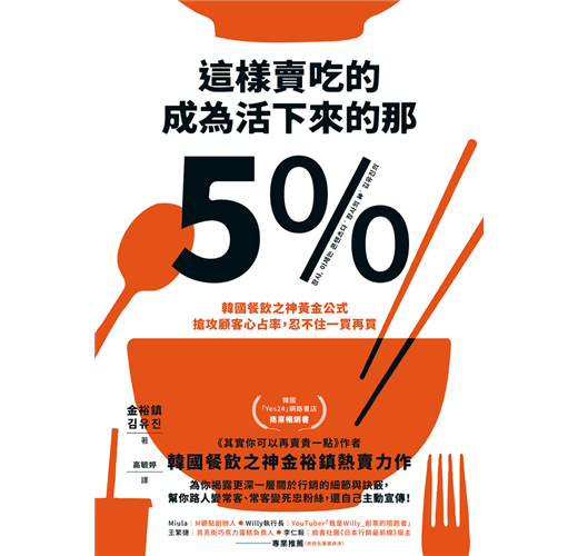 如果《其實你可以再賣貴一點》是一本關於數字的法寶,幫你搞定訂價策略的疑難雜症,那《這樣賣吃的,成為活下來的那5%》能為你揭露更深一層關於行銷的細節與訣竅,讓路過的客人停下來;讓沒有特別期待,只是隨機進店的客人變常客;讓常客變成死忠粉絲,還自動幫你宣傳!