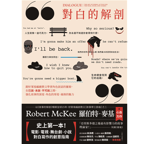 史上第一本對白寫作教學書。麥基徹底剖析了對白的可見與不可見結構。他掌握了一門通常被視為只能憑據本能、有如魔法一般的技藝,並揭露它在人心造就化學反應的祕密。——Terry Johnson/編劇暨導演,奧利佛獎(Olivier Award)、劇評人獎(Critics' Circle Theater Award)、美國編劇工會獎、英國影藝學院電影獎得主