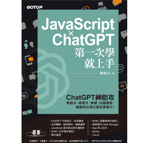 在本書中,我們除了告訴您如何使用ChatGPT撰寫程式、解讀程式、查詢語法、尋求技術支援、除錯、出題練習、在JavaScript與其它程式語言之間做轉換,更重要的是有計畫地帶您學習JavaScript,無論您有無程式設計的經驗,只要約略具有HTML與CSS的基礎知識,都能看得懂、學得會,不會愈看愈挫折、半途而廢。
