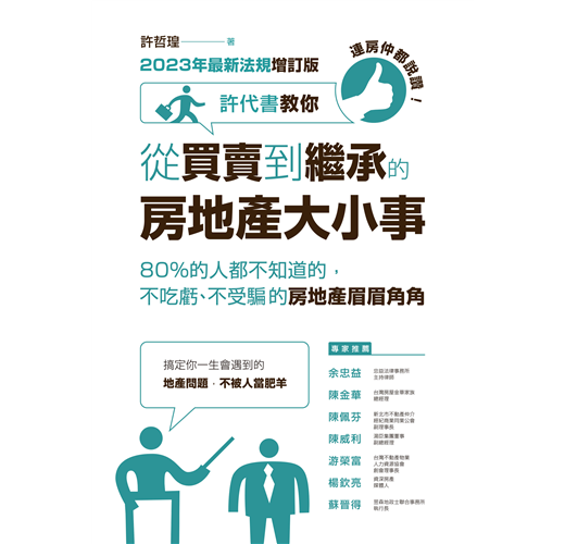 而不動產相關法令規定,常常因為時空背景的關係會有所修改,因此本書於2023年改版,將近年有關不動產修法部分予以更新,讓本書內容符合最新法令規定,更貼合有志學習不動產相關知識的普羅大眾,希望這本書能為你們打開通往房地產專業知識的大門,期許每位讀者都能透過這本書簡單且輕鬆帶走我修練多年的內功心法,期望每位讀者都能在閱讀後,具備一定的不動產相關知識,並找到屬於自己的一片天空⋯⋯。