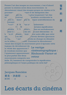 如果這些記憶,在收到這份意想不到的獎時,又回到我的腦海,並不只是出於這個境遇;如果我今天提起它們,也並非是對遙遠歲月的懷念,而是因為它們很好地描繪了我看待電影的獨特性。電影,並不是我作為哲學家或批評家所依賴的對象。我和它的關係,是一場相遇和差距的遊戲,並且得以經由三個記憶來勾勒。它們實際上總結出三種差距的類型,而我試圖在其中談論電影:在電影與藝術之間、電影與政治之間、電影與理論之間。