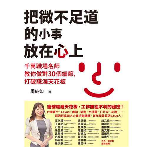 純如老師一路從行政收發、祕書、幕僚,做到科技公司董事,具備豐富的基層、管理與教學經驗,深刻了解中階主管面臨的兩難處境、新進人員容易疏忽的應對細節。在這本書中,她分享個人經驗與實際案例,並提供解決方案,協助職場工作者減少摸索、自我懷疑的心力,掌握對上、對下、橫向溝通的要點,會做事又會做人的訣竅。