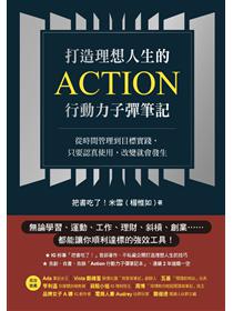 讀者只需要一本「Action行動力子彈筆記本」就可以把這個強大的規劃工具、以及這套有效的方法、還有隨著使用該工具與學習此方法後,所自然產生的行動力,全部打包帶著走。除了目標的實踐,還有日常生活上的管理與工作方面的規劃,也都可以透過Action一次做到位。