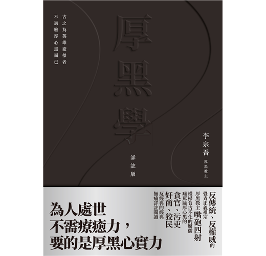 中國近四千年,一部二十四史,一言以蔽之,厚黑而已。李宗吾為民初厚黑學教主,鑽研中國君王與偉人的特性,心要同劉邦一樣黑,才能夠從項羽手中奪天下;臉要同劉備一樣厚,才能哭出一片江山。李宗吾深讀四書五經,破解中國近四千年的歷史奧義,褪下成功之人神聖的包裝,習得厚黑真本領,讀懂人性,處處占盡上風的處世絕學。