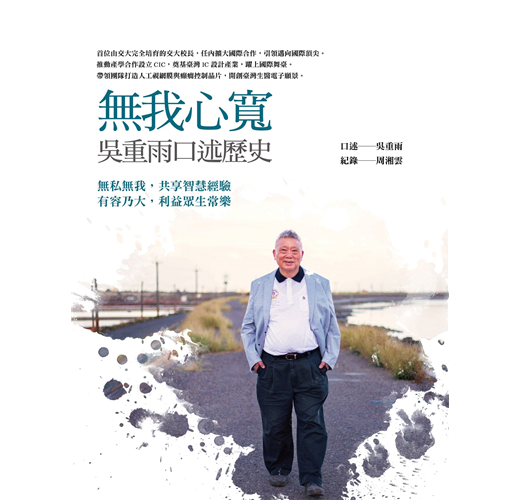 《無我心寬:吳重雨口述歷史》一書,紀錄下吳重雨的成長經歷與人生發展,主要是以他在半導體IC設計的專業研究與教學為重心,延伸到參與推動國家科技產業政策及學校行政時的方向;又擴展到技術創新與新創產業。透過吳重雨校長在人生各階段中印象深刻的經驗回憶,替交大與產業發展留下一些見證的紀錄。